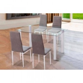 PACK COMPUESTO POR:• MESA DE COMEDOR YURICOLOR: TAPA EN VIDRIO TEMPLADO CON PATAS EN METAL NEGRO.MEDIDAS: L 140 x A 90 x P 75cm• 4 SILLAS YURICOLOR: TELA EN MICROFIBRA GRIS CON PATAS EN METAL NEGRO.